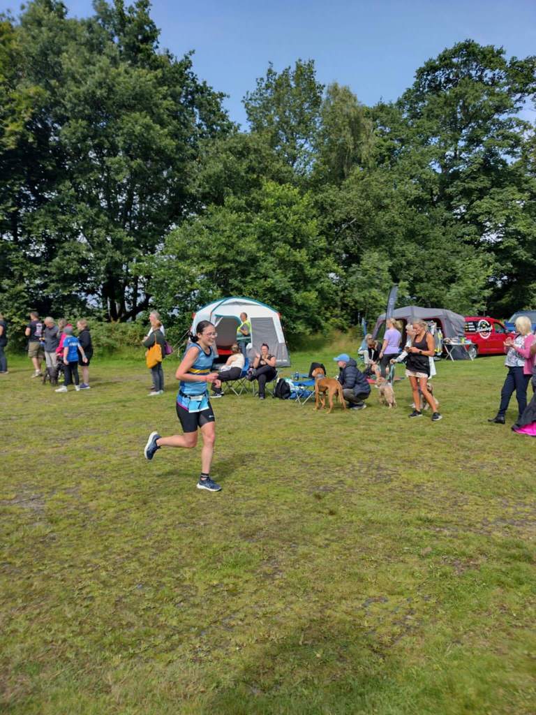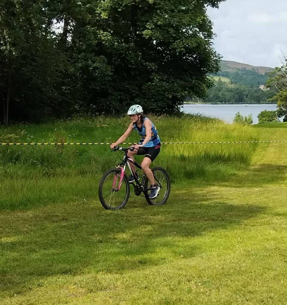 After the swim it was onto the bike, and this is where I was instantly regretting my complacency and acutely aware that even though 9km doesn’t sound a lot on a bike – a few spin classes and cycling to work occasionally is not going to prepare you for a technical mountain bike course like the one I was on. It didn’t help that I had never been on a mountain bike before or even tried a mountain bike terrain. I took it for granted, after watching the Youtube video of the course that it looked manageable and how hard could it be? Wrong attitude and hard lesson learned as I really struggled. The terrain was super tough. Some really challenging aspects we needed to navigate and as I said, first time being on a mountain bike I borrowed from my brother-in-law and had no idea how to use the gears! After 47 painful minutes I was off the bike on to the run, by which point my body felt like lead. I still had fuel in the tank but 3km is extremely tough when your body is fatigued and struggling after the hellish mountain bike ride. I was so delighted to see a fellow Harrier pass me on her home run. I hadn’t met Jennifer before, but it was so lovely to see the Harriers colours and feel part of this team. That gave me the wee boost I needed to drag myself across the finish line.