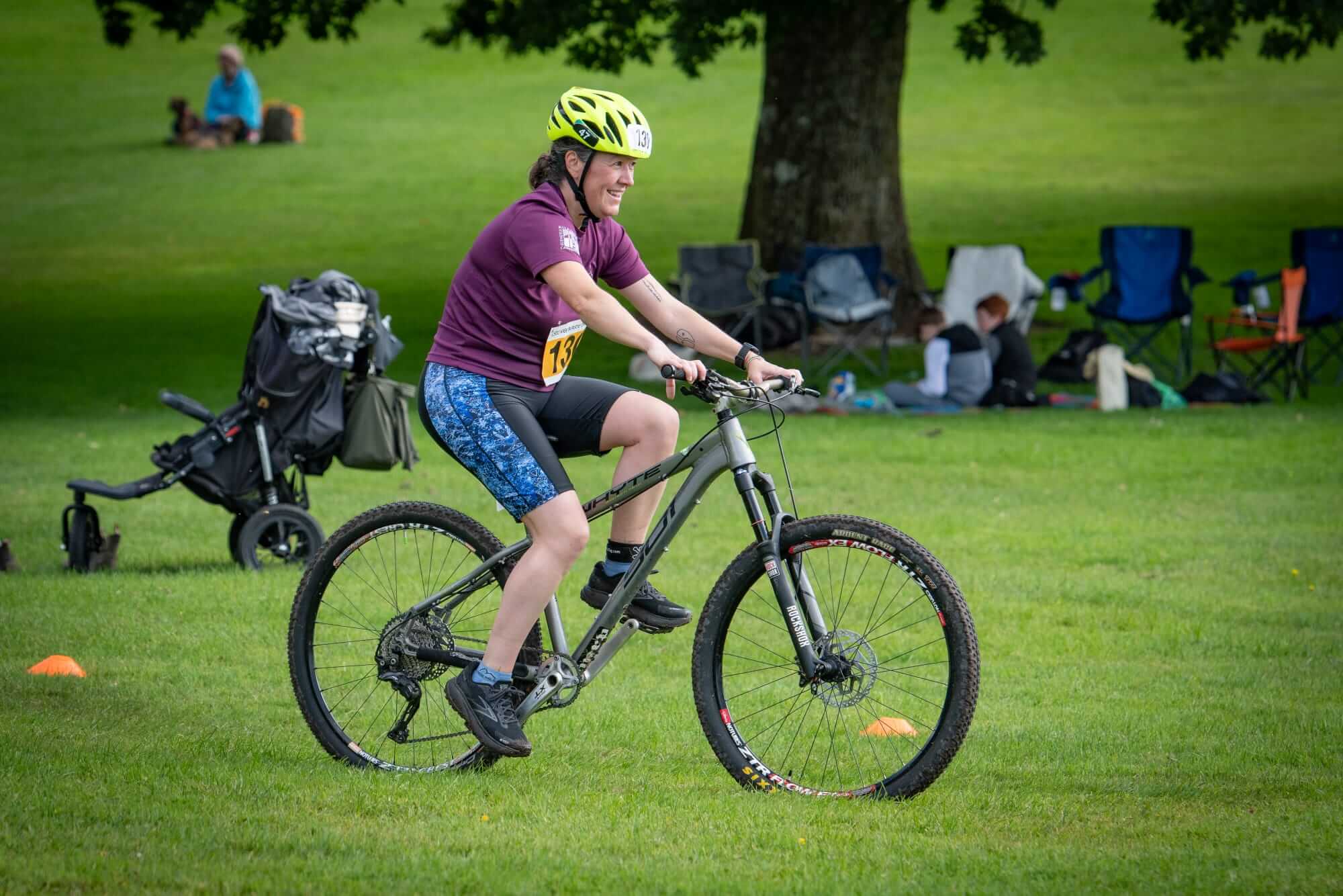 After removing my wetsuit, flinging on my trainers, helmet and GGH vest, and successfully navigating the first transition with no penalties, I set off on the bike for what is a really technical mountain bike course – a three-lap course with a mixture of cycling across grass, through deep mud, across gravel and with some really tight turns and steep downhills. There are also some nasty uphill sections including “chainbreak hill” with a grade of almost 15% on a grass surface which features in all three laps. Although the course was really challenging, I thought it was great fun and I actually enjoyed the bike section the most. I felt strong on the bike and found myself overtaking a number of other athletes, although I did take the downhills quite cautiously so as not to have a repeat of my first Beastie experience where my bike slipped on the grass and I broke my wrist! Although I was still completely unaware of my race position I went into transition 2 having moved up into third place (female).
