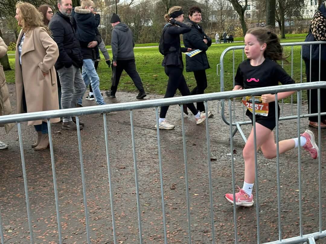 It started with a gentle drizzle, but under the shelter of Pollock Park’s beautiful woodlands, the atmosphere was perfect. The first kilometer challenged runners with a steady uphill, setting a strong tone for the McLaughlin/Killeen family, running together for the very first time. Three generations—Danny (the O.G. Harrier and Granda), Mum Lana, and sisters Mila and Leia—decided to stay together as a family unit. By the 3k mark, Leia, like a greyhound eager for speed, sprinted ahead with Granda by her side, finishing her first-ever 5k at an impressive 32:20. Mila chose to stick with Mum, both finishing strong and proud at 33:20. It was a race not just about the run, but about a family milestone, making this 5k unforgettable. Also running was Jill Turner who set out at a conservative pace before picking up as she progressed into her run. A solid run on what seems like a good day out. Jill then set off to Bellahouston Park to cheer on the plethora of Harriers who were running the Jimmy Irvine on the same day.