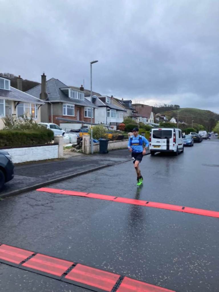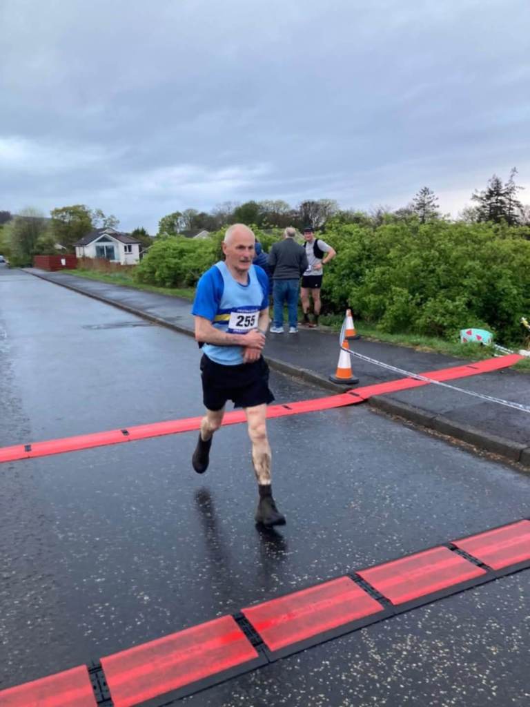 Just two harriers managed to travel down to Fairlie for Kaim Hill Race. Weather conditions were horrendous before the race with heavy rainfall. This meant that participants had to carry full safety equipment, unusually as it normally takes place in glorious sunshine. Owen Atkinson, on his birthday, and Micky Dunn, after his recent HYROX success,met at the village church for registration then ran slowly up to the start line regretting their decision to enter. However, the rain stopped just before the race started and the mood lifted. Due to the poor conditions kit had to be carried so backpacks and bum bags were mandatory. 108 runners took to the start line with a big representation from Westies. There is a short section of tarmac before heading up the Fairlie Glen, a scenic narrow winding trail with lots of tree roots and uneven path underfoot to keep you alert. After reaching the kissing gate at the top of the glen there’s a tricky burn crossing to contend with, before a climb up a steep and very muddy bank gains you access to the open hillside covered with rough heather and grassy tussocks. A slightly different route this year follows a quad bike track on the summit plateau in an anti-clockwise direction to the cairn. At the turn the descent takes you down through another bog and back down the same route to the welcoming finishing line. Caution required on the descent down through the glen due to the tree roots and rocks. A few epic falls on the way down on the muddy path meant that both Owen and Micky had a few cuts and bruises. Micky made sure his teeth were screwed in tight so there was no need to go searching for any false teeth this year!