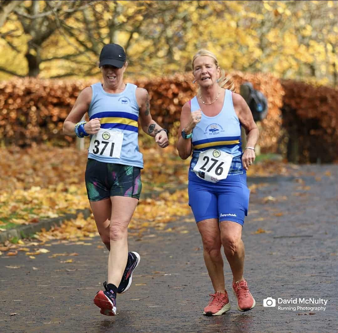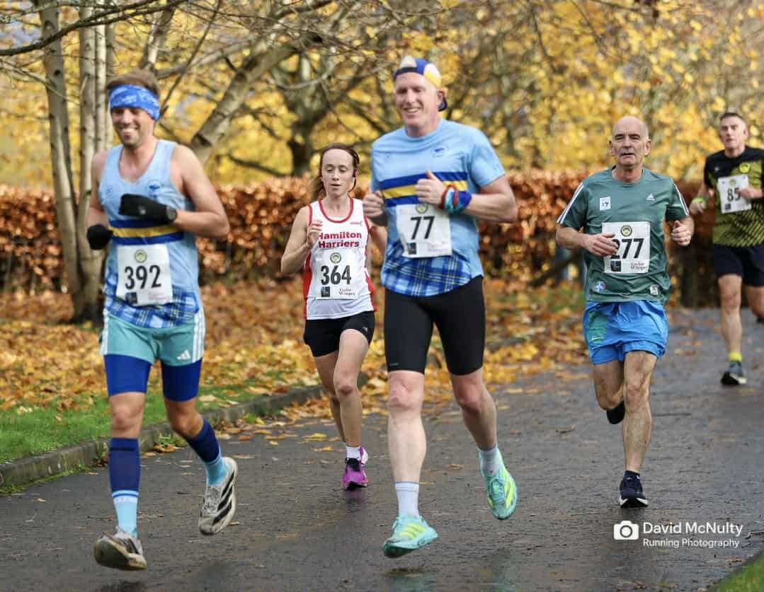 With a week in La Santa fast approaching, Robin McAuslan (46:13) and Stephen Reid’s (47:09) racing year is far from over; both gents ran well despite some challenging underfoot conditions on parts of the route. Fireworks were to follow… It would be an 8th of November to remember remember for Aidan Coyle (48:15), who took an incredible 53 seconds off his PB – set just 5 weeks prior at the Great Scottish Run. Aidan has shown great resilience on his comeback from injury, and was paced well on the day by clubmate David Thomson (48:15).