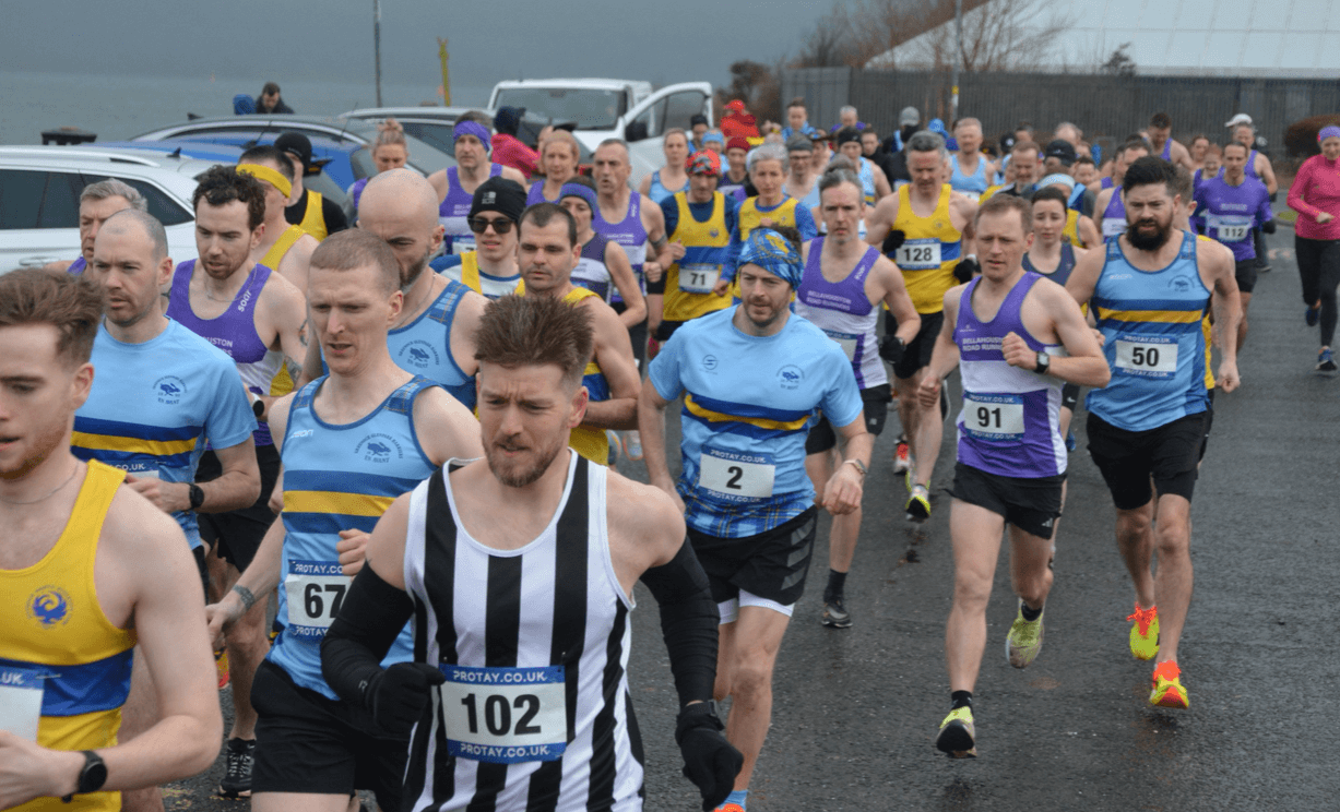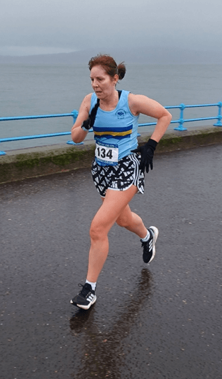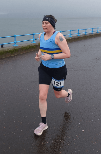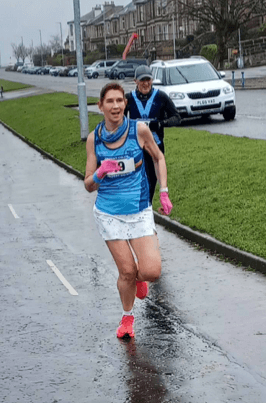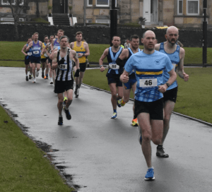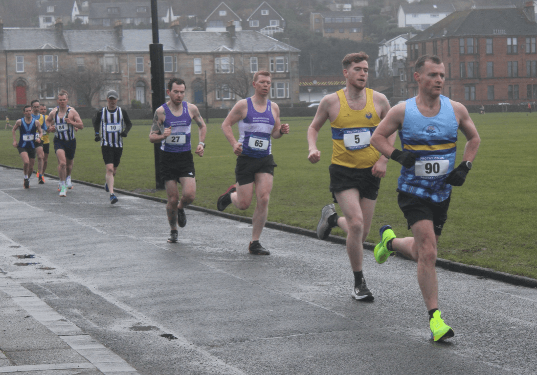 The Weather was as expected for this year’s RAAA Road Race Championships, hosted by Inverclyde Athletics Club – cold, wet and with a difficult-to-predict, strong swirling wind helping and hindering at various points along the course. Runners start behind the Pavilion in the Battery Park, completing a full loop before heading out along the Esplanade to a turn at the Cafe End, the back stretch complemented by a lap and a half of the Park before a race down the middle to the finish.