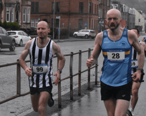 Going under 30 minutes for five miles is a great achievement, and for Greenock Glenpark we had John Logan (27:45) continuing his fine run of form as first Harrier to finish, 16th overall and 12th in the Senior Category. He had a strong race with the returning Stuart Greenway (27:59) – great to see Stuart in the vest again as he nabbed Senior 13th spot and 17th overall. Another sub 30 battle over the distance was between Vice Captain Daniel Doherty (28:24) and Chris Mooney (28:29). Both men have really been putting the training to good use and this was another fantastic effort, with Daniel going 5th in the V40 category, Chris close behind in 6th / V40.